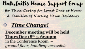 • The 2025 schedule for our Support Group for Caregivers & Families has been posted: If a loved one is residing here at Matulaitis Home or another long-term care facility in the area, or if you are caring for a loved one at home, consider joining our monthly support group and know that you are not alone in the challenges you face as a caregiver.  See the flyer for details.