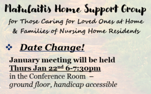 - The 2026 schedule for our Support Group for Caregivers & Families has been posted: If a loved one is residing here at Matulaitis Home or another long-term care facility in the area, or if you are caring for a loved one at home, consider joining our monthly support group and know that you are not alone in the challenges you face as a caregiver. See the flyer for details.